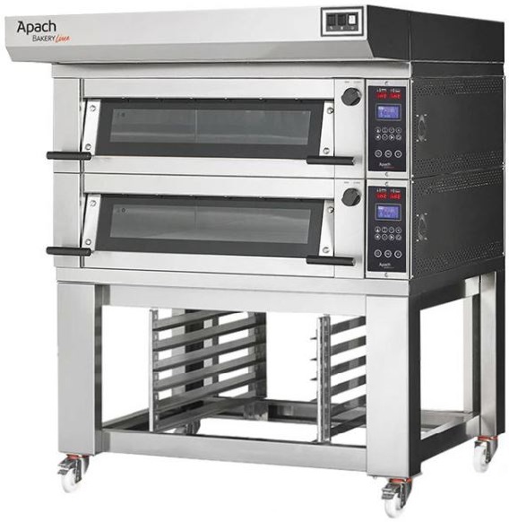 Печь подовая Apach Bakery Line E4LK1SLOW DPBI-T серии E используется на предприятиях общественного питания, торговли, пищевых производствах, в пекарнях и кондитерских для приготовления различных блюд, выпечки хлебобулочных и кондитерских изделий. Модель оборудована цифровым управлением с раздельным контролем температур: верх/низ, вытяжкой пара, независимым парогенератором на каждый под, соединительным комплектом для воды и электричества, дверьми со смотровым окном и подставкой на колесах. Материал козырька, подставки и корпуса - высококачественная нержавеющая сталь, материал основания - цементный агломерат с металлическим каркасом, материал теплоизоляции - минеральная вата.