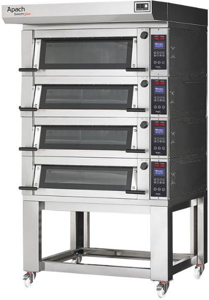 Печь подовая Apach Bakery Line E2LK9L DPBI-T серии E используется на предприятиях общественного питания, торговли, пищевых производствах, в пекарнях и кондитерских для приготовления различных блюд, выпечки хлебобулочных и кондитерских изделий. Модель оборудована цифровым управлением с раздельным контролем температур: верх/низ, вытяжкой пара, соединительным комплектом для воды и электричества, дверью со смотровым окном и подставкой на колесах. Материал козырька, подставки и корпуса - высококачественная нержавеющая сталь, материал основания - цементный агломерат с металлическим каркасом, материал теплоизоляции - минеральная вата.