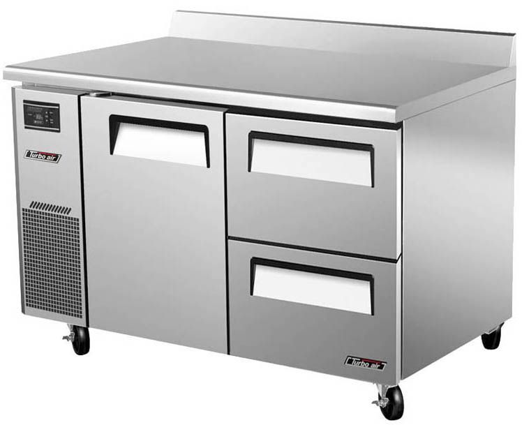 Холодильный стол Turbo air KWR12-2D-2 предназначен для раскатки теста, обработки, охлаждения и кратковременного хранения продуктов и напитков на предприятиях общественного питания и торговли. Корпус выполнен из нержавеющей стали (гальванизированная сталь на оборотной стороне и внизу) с применением пожаробезопасных стенок толщиной 60 мм, уплотнения - из АБС-пластика (акрилонитрилбутадиенстирола), не пропускающего конденсата, пол - из нержавеющей стали с алюминиевыми вставками по бокам и сзади оборудования, тройные направляющие - из высококачественной нержавеющей стали.