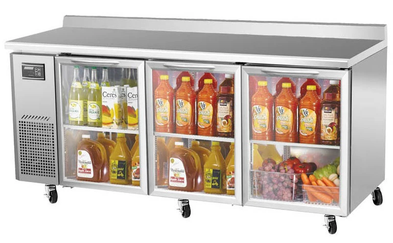 Холодильный стол Turbo air KGWR18-3-600 используется на предприятиях общественного питания, торговли и пищевых производствах для обработки ингредиентов, приготовления блюд, а также демонстрации и кратковременного охлаждения продуктов и напитков. 3 стеклянные двери, 3 регулируемые полки. Материал корпуса и дверных петель - нержавеющая сталь, материал задней и нижней панели - гальванизированная сталь, материал пола - нержавеющая сталь с алюминиевыми вставками, материал полок - толстая стальная проволока с виниловым покрытием, материал уплотнения - ABS-пластик.