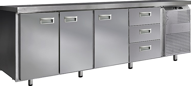 Холодильный стол Finist СХС-600-3/3 используется на предприятиях общественного питания, торговли и пищевых производствах для хранения и обработки полуфабрикатов из мяса и рыбы, заготовок для салата, охлажденных напитков и прочих пищевых продуктов. Управление при помощи кнопочной панели управления, оснащенной цифровым дисплеем. 3 холодильные камеры с распашными дверцами, 3 выдвижных ящика, агрегатный отсек располагается сбоку. Стол установлен на ножки с подпятниками. Материал корпуса - нержавеющая сталь.