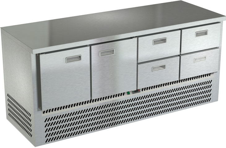 Холодильный стол Техно-ТТ СПН/О-122/24-1906 предназначается для раскатки теста, обработки, охлаждения и кратковременного хранения продуктов и напитков на предприятиях общественного питания, торговли и пищевых производствах. Секции оснащены направляющими и решетчатыми полками, двери и ящики - доводчиками. Материал корпуса и столешницы - нержавеющая сталь AISI 430, материал задней панели и дна - оцинкованная сталь.