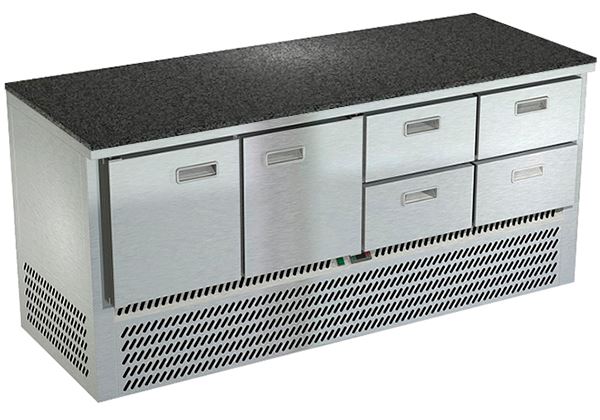 Холодильный стол Техно-ТТ СПБ/О-323/04-1306 предназначается для раскатки теста, обработки, охлаждения и кратковременного хранения продуктов и напитков на предприятиях общественного питания, торговли и пищевых производствах. Секции оснащены направляющими и ящиками с доводчиками. Материал корпуса - нержавеющая сталь AISI 430, материал столешницы - гранит (толщина 20 мм), материал задней панели и дна - оцинкованная сталь.