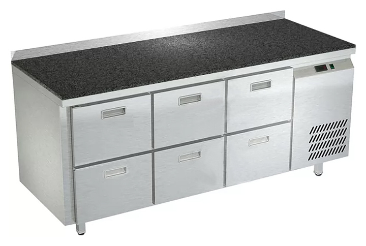 Холодильный стол Техно-ТТ СПБ/О-423/06-1807 предназначается для раскатки теста, обработки, охлаждения и кратковременного хранения продуктов и напитков на предприятиях общественного питания, торговли и пищевых производствах. Секции оснащены направляющими и ящиками с доводчиками. Материал корпуса - нержавеющая сталь AISI 430, материал столешницы - гранит (толщина 20 мм), материал задней панели и дна - оцинкованная сталь.
