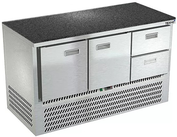 Холодильный стол Техно-ТТ СПН/О-322/22-1406 предназначается для раскатки теста, обработки, охлаждения и кратковременного хранения продуктов и напитков на предприятиях общественного питания, торговли и пищевых производствах. Секции оснащены направляющими и ящиками с доводчиками. Материал корпуса - нержавеющая сталь AISI 430, материал столешницы - гранит (толщина 20 мм), материал задней панели и дна - оцинкованная сталь.