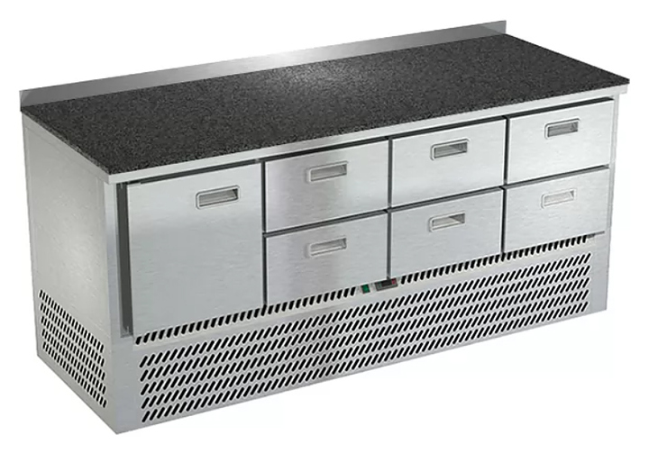 Холодильный стол Техно-ТТ СПН/О-422/16-1907 предназначается для раскатки теста, обработки, охлаждения и кратковременного хранения продуктов и напитков на предприятиях общественного питания, торговли и пищевых производствах. Секции оснащены направляющими и ящиками с доводчиками. Материал корпуса - нержавеющая сталь AISI 430, материал столешницы - гранит (толщина 20 мм), материал задней панели и дна - оцинкованная сталь.
