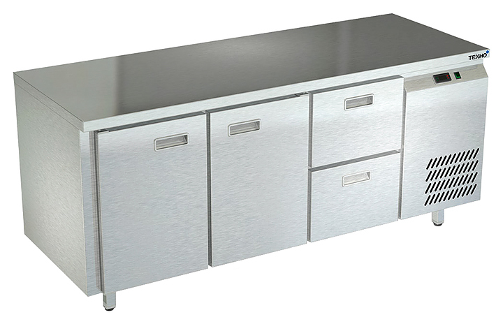 Холодильный стол Техно-ТТ СПБ/Т-122/22-1806 предназначается для раскатки теста, обработки продуктов и ингредиентов, заморозки и хранения продукции, а также для размещения теплового оборудования на предприятиях общественного питания, торговли и пищевых производствах. Двери оснащены доводчиками. Материал корпуса и столешницы - нержавеющая сталь AISI 430, материал дна и задней панели - оцинкованная сталь.
