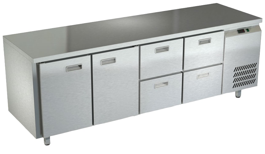 Холодильный стол Техно-ТТ СПБ/Т-122/24-2206 предназначается для раскатки теста, обработки продуктов и ингредиентов, заморозки и хранения продукции, а также для размещения теплового оборудования на предприятиях общественного питания, торговли и пищевых производствах. Двери оснащены доводчиками. Материал корпуса и столешницы - нержавеющая сталь AISI 430, материал дна и задней панели - оцинкованная сталь.