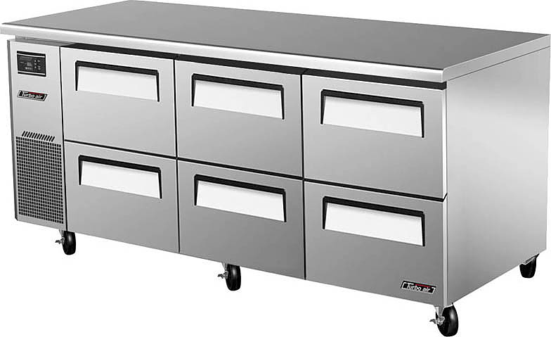 Холодильный стол Turbo air KUR18-2D-6 используется на предприятиях общественного питания, торговли и пищевых производствах для обработки, охлаждения и кратковременного хранения продуктов, а также для раскатки теста. Модель оснащена электронным управлением и автоматическим размораживанием. Материал корпуса - высококачественная нержавеющая сталь (гальванизированная сталь на оборотной стороне и внизу) с применением пожаробезопасных стенок толщиной 60 мм, материал уплотнения - АБС-пластик (акрилонитрилбутадиенстирола), материал пола - нержавеющая сталь с алюминиевыми вставками по бокам и сзади оборудования, материал тройных направляющих - нержавеющая сталь.