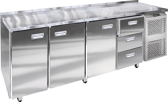 Холодильный стол Finist УХС-600-3/3 используется на предприятиях общественного питания, торговли и пищевых производствах для хранения и обработки полуфабрикатов из мяса и рыбы, заготовок для салата, охлажденных напитков и прочих пищевых продуктов. Управление при помощи кнопочной панели управления, оснащенной цифровым дисплеем. 3 холодильные камеры с распашными дверцами, 1 секция с 3 выдвижными ящиками с доводчиками, агрегатный отсек располагается сбоку. Стол установлен на ножки с подпятниками. Материал корпуса - нержавеющая сталь.