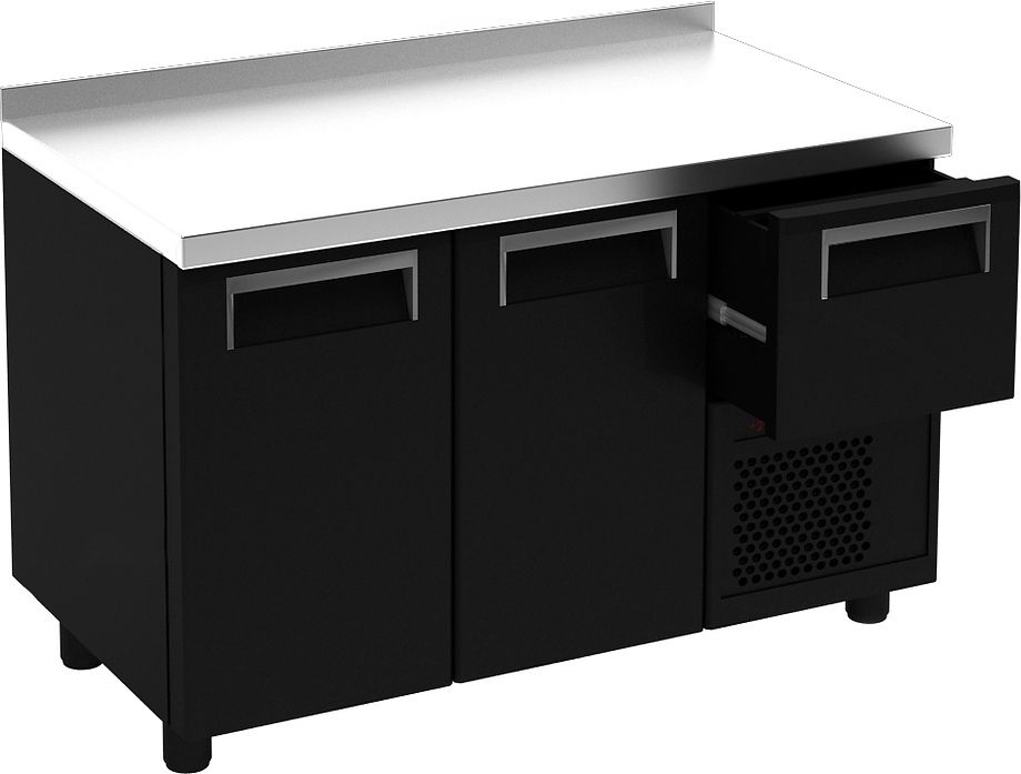 Холодильный стол Carboma T57 M2-1-C 9006-1(2)9 (BAR-360К) предназначен для размещения кофемашин и охлаждения и хранения молока и кофейных зерен на предприятиях общественного питания и торговли. Модель оснащена 2 раздвижными дверьми-купе, 4 полками, охлаждаемым ящиком под агрегатом, планкой под выбивание холдера и регулируемыми ножками высотой от 90 до 110 мм. Цельнозаливной корпус выполнен из черной крашеной стали, столешница - из нержавеющей стали, дверцы - из стекла.