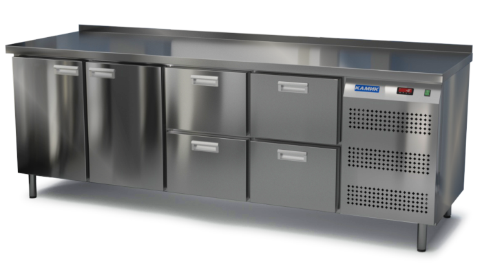 Холодильный стол КАМИК СО-Т-24237 используется на предприятиях общественного питания и торговли для охлаждения и хранения продуктов, напитков и готовых блюд, а также для установки теплового оборудования на него. Конструкция разделена на секции, каждая из которых оборудована сетчатой полкой и парой направляющих. Корпус выполнен из нержавеющей стали.
