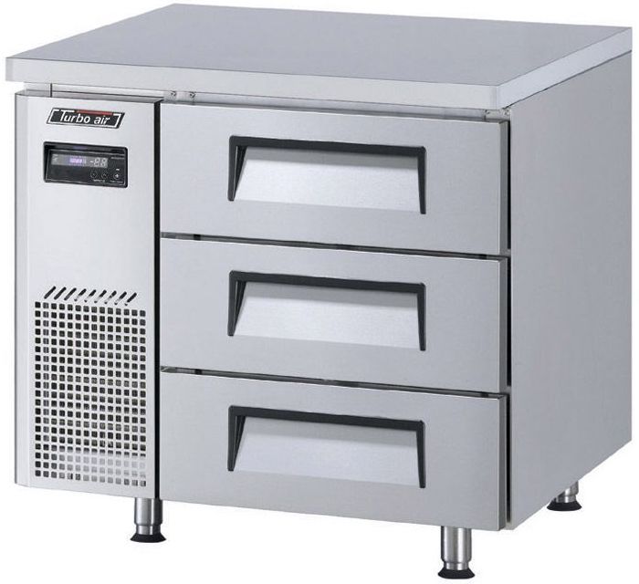 Холодильный стол Turbo air KUR9-3D-3 состоит из рабочей поверхности, на которой можно раскатывать тесто и обрабатывать ингредиенты для приготовления блюд, и камеры, предназначенной для охлаждения и кратковременного хранения скоропортящихся продуктов и напитков на предприятиях пищевой промышленности, общественного питания и торговли. Корпус выполнен из нержавеющей стали с применением пожаробезопасных стенок толщиной 60 мм и уплотнения из теплоэффективного АБС-пластика (акрилонитрилбутадиенстирола), не пропускающего конденсата, оборотная сторона и низ изготовлены из гальванизированной стали, пол - из нержавеющей стали с алюминиевыми вставками по бокам и сзади, 4 регулируемые ножки - из нержавеющей стали.