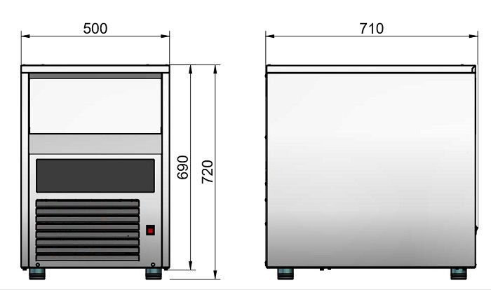 Конструкция и съемная обшивка выполнены из высококачественной нержавеющей стали (за исключением задней стенки), контейнер для льда - из пищевого термоформованного пластика, стенки изолированны пенополиуретаном с высокой плотностью. Эксплуатация льдогенератора допускается при температуре окружающей среды от 10 до 43 °C и относительной влажности от 40 до 70%.