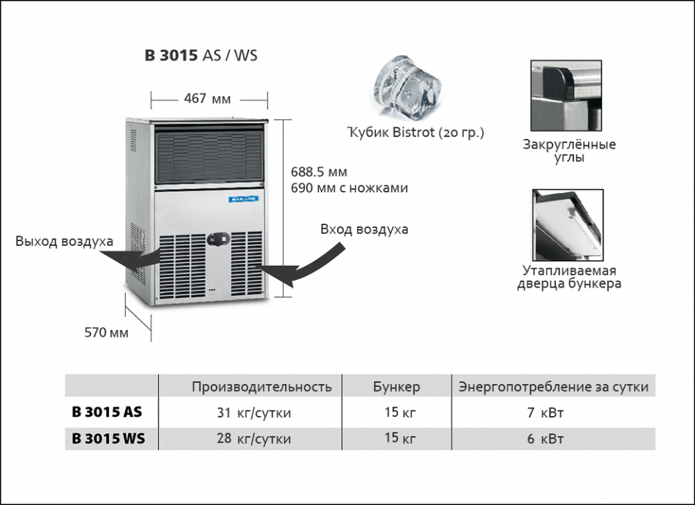 Льдогенератор BAR LINE (SCOTSMAN) B 3015 AS используется для производства кубикового льда Bistrot в форме "наперстка" на предприятиях общественного питания и торговли. Корпус выполнен из нержавеющей стали с антикоррозионной стойкостью. Оборудование работает на хладагенте R404a.