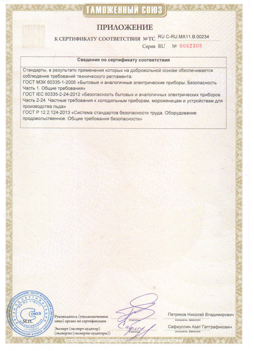 Конструкция и съемная обшивка выполнены из высококачественной нержавеющей стали. Эксплуатация льдогенератора допускается при температуре окружающей среды от 10 до 35 °C и относительной влажности от 40 до 70%.