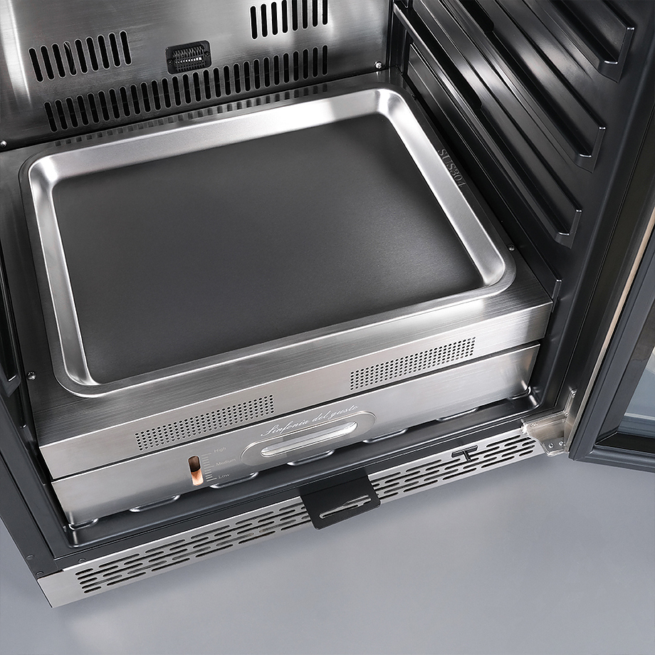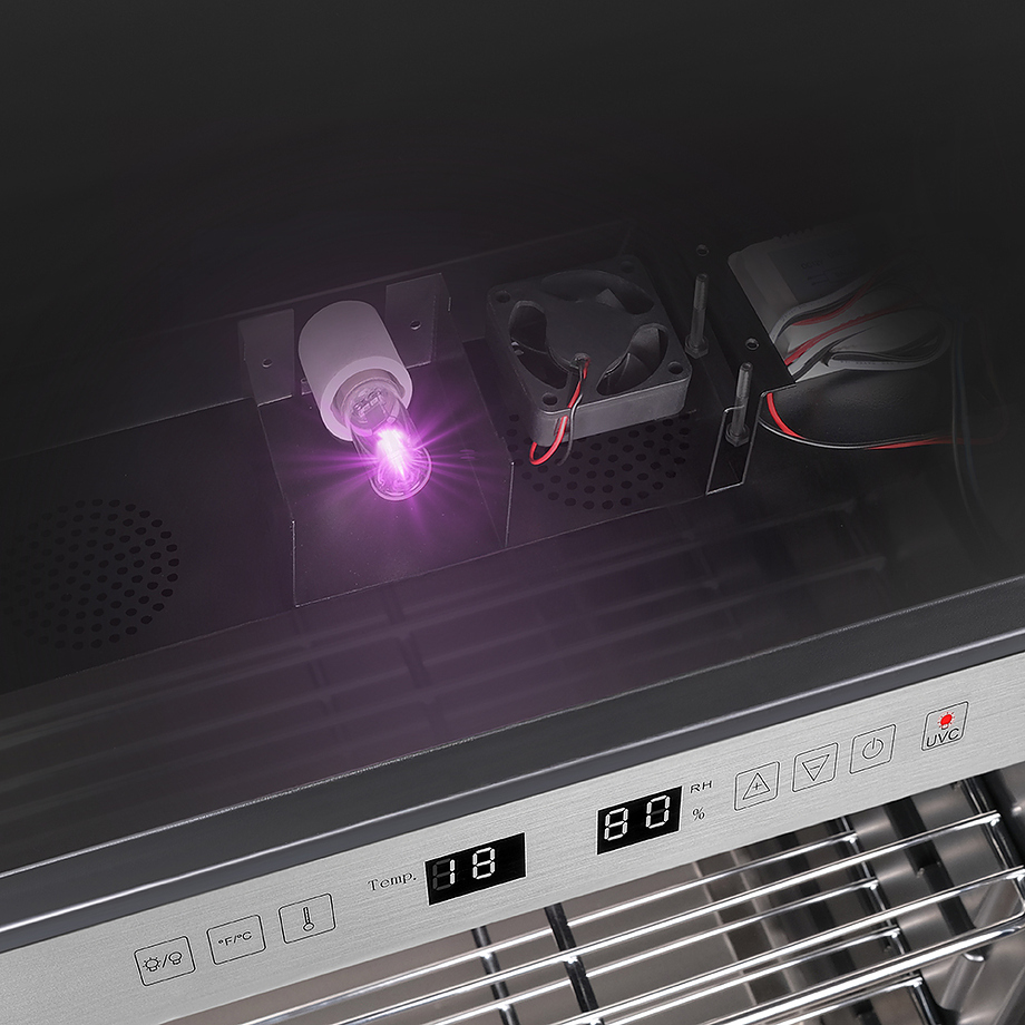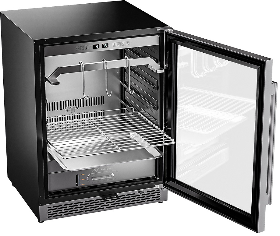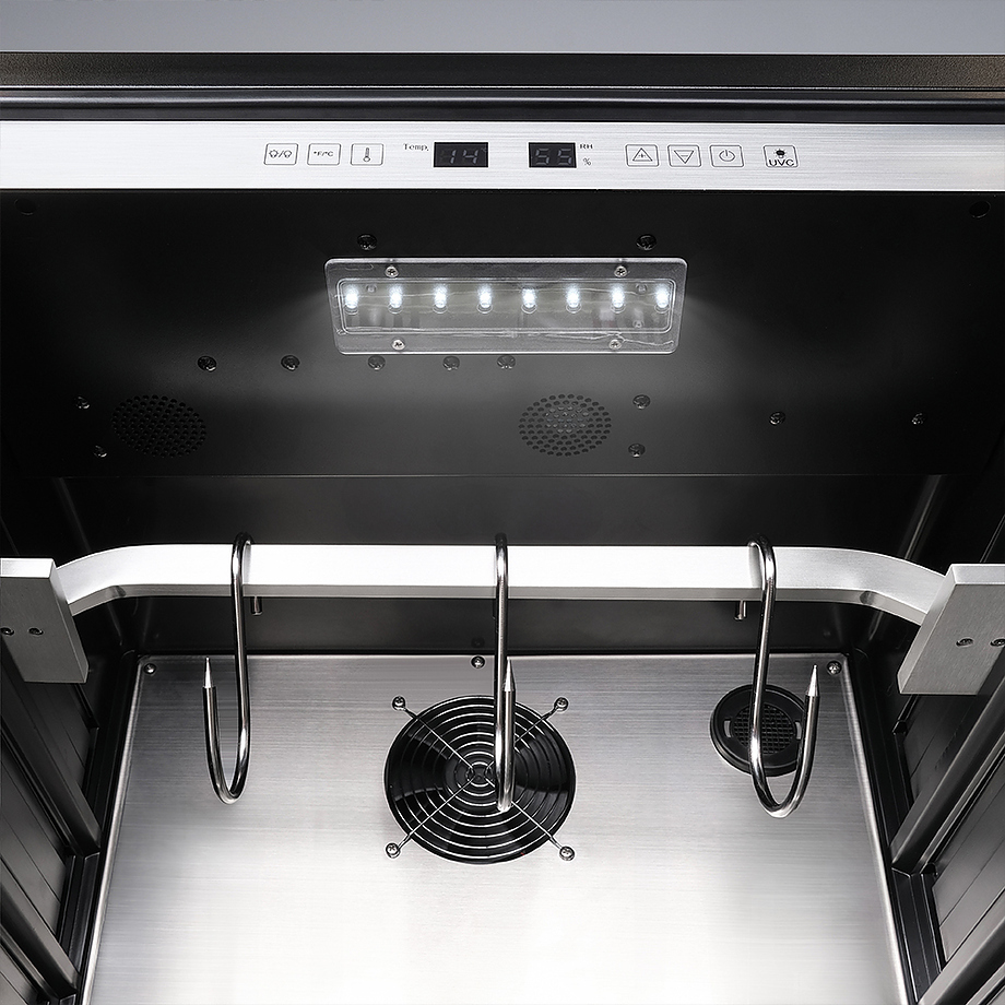 Шкаф Meyvel MM-45SR используется для охлаждения, хранения и вызревания мяса, птицы, колбасы, рыбы, ветчины, сыра и салями на предприятиях общественного питания, торговли, пищевых производствах и в домашних условиях. Модель оснащена сенсорным управлением, угольным фильтром, подсветкой, демонстрационным освещением, выдвижными полками, удобной ручкой, замком, поддоном для гималайской соли и регулируемыми по высоте ножками. Материал корпуса и ручки - сталь, материал рамки двери - бесшовная нержавеющая сталь, материал двери - тройное стекло с УФ фильтром, материал полок-решеток - хромированный металл.