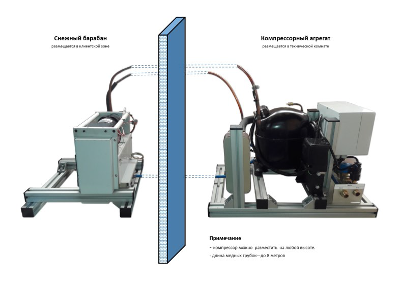 Раздельный снегогенератор R-Snow SPLIT-XL ES600-1SA используется для производства снега и нашёл своё применение в банях и СПА. Оборудование из 2х частей - снежного барабана и компрессора с блоком управления.