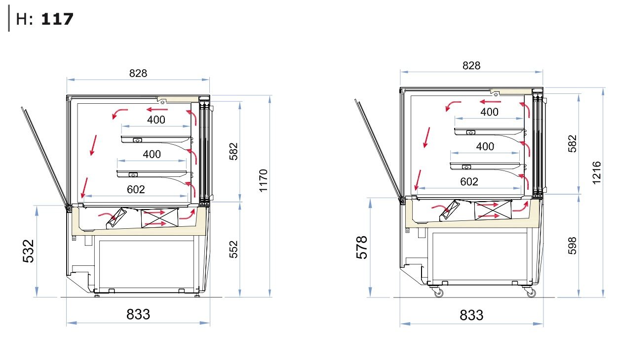 Модель оснащена раздвижными дверцами со стороны оператора, что позволяет изолировать охлаждаемый объем от проникновения внешнего тепла. Каркас и основание витрины, а также передняя техническая панель изготовлены из углеродистой стали, окрашенной порошковой краской, зона выкладки, рабочая поверхность, задняя панель, передняя нижняя решётка, кронштейны полок и перфорированные стойки для фиксации кронштейнов на разной высоте - из нержавеющей стали. Цельный корпус имеет изоляцию из пенополиуретана, вспененного углекислотой, без использования озоноразрушающих веществ.