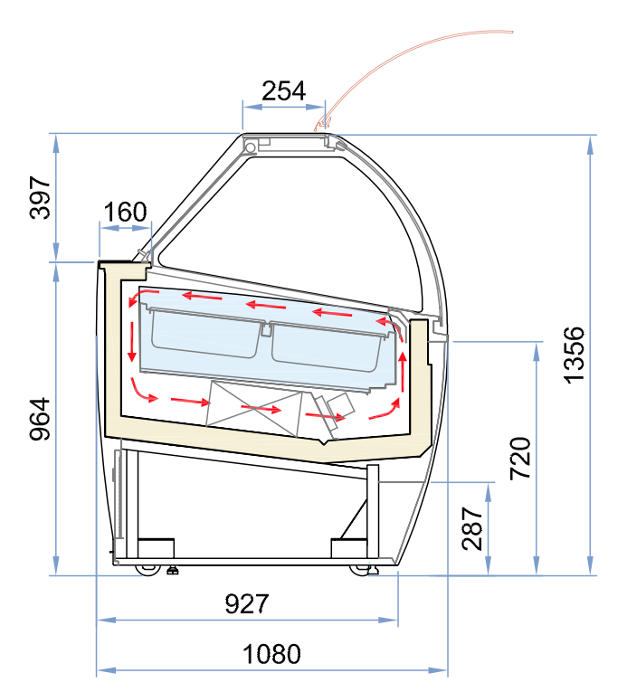 Каркас витрины изготовлен из углеродистой стали, окрашенной порошковой краской, дно зоны выкладки - из полированной нержавеющей стали, задняя панель - из пластифицированной стали, передняя панель - из окрашенной стали, полка - из алюминия, анодированного серебром. Цельный корпус имеет изоляцию из пенополиуретана, вспененного углекислотой, без использования озоноразрушающих веществ.
