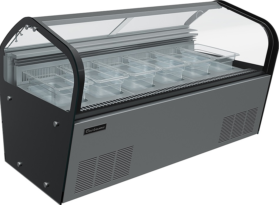 Витрина для мороженого Carboma I60 VL 1,2-1 JOY предназначается для охлаждения, хранения и демонстрации мороженого на предприятиях общественного питания и торговли. Управление при помощи электронного блока Carel, динамическая система охлаждения. Витрина оснащена прозрачным изогнутым фронтальным стеклом и 2 боковыми стеклопакетами. Опоры регулируются по высоте. Материал каркаса - сталь с антикоррозийным покрытием, материал фронтальной панели и экспозиционных поддонов - нержавеющая сталь, материал гастроемкостей - прозрачный поликарбонат, материал термоизоляции - пенополиуретан.