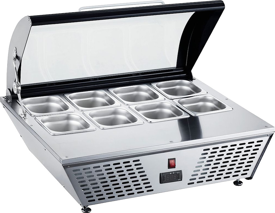 Витрина для мороженого Koreco RTD67L используется на предприятиях общественного питания и торговли для демонстрации и хранения мороженого, сорбета и йогурт-мороженого. Корпус трапециевидного сечения, зауженный к низу, выполнен из нержавеющей стали, крышка - из стекла.