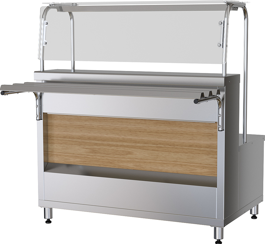 Прилавок-мармит Марихолодмаш ПМПЭ11 используется в составе линии раздачи Шеф 1120 на предприятиях общественного питания, торговли и пищевых производствах для демонстрационной выкладки и кратковременного хранения первых блюд, хлебобулочных и кондитерских изделий, напитков и посуды. Прилавок оснащен конфоркой, полкой, диодной подсветкой и защитным экраном. Материал корпуса - высококачественная нержавеющая сталь.