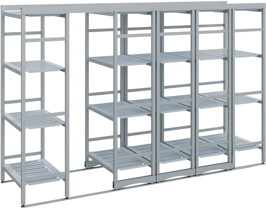 Модульный передвижной стеллаж POLAIR LOAD.ME COMPACT SC 5PP.50.08.4 используется на предприятиях общественного питания, торговли, производствах, складских помещениях, прачечных и прочих предприятиях для хранения продукции. Решетчатые полки регулируется по высоте. Стеллаж оснащен колесиками внизу модуля и роликами сверху. Модель может использоваться как самостоятельно, так и соединяться в линии с другими передвижными стеллажами с помощью специальной рельсовой системы. Передвижные модули размещаются между стационарными стеллажами. Материал каркаса - анодированный алюминиевый профиль, материал полок - армированный полипропилен.