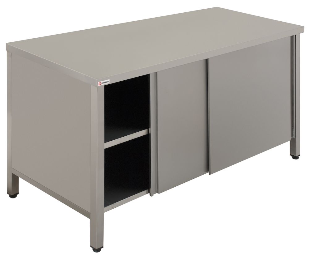Simeco СЗE1706К используется на предприятиях общественного питания и торговли для приготовления различных блюд, а так же для хранения посуды и сыпучих продуктов. Модель закрыта с трех сторон. Имеет двери-купе и сплошную полку из нержавеющей стали. Каркас стола выполнен из нержавеющей стали AISI 430, столешница - из нержавеющей стали AISI 430. Ножки - труба 40х40 мм.