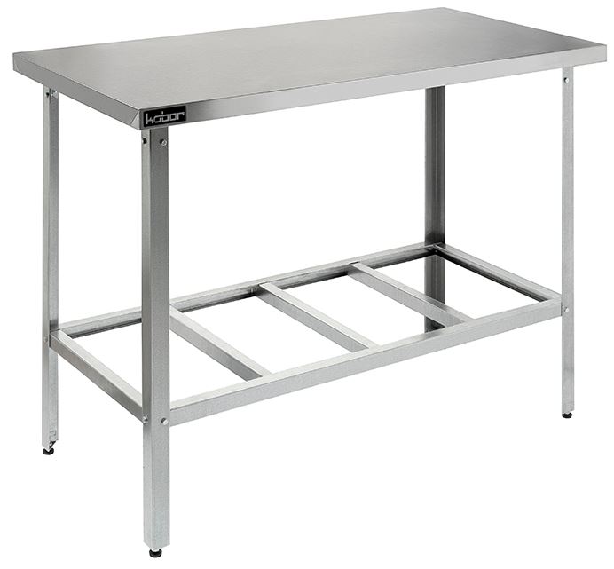 Столешница стола Кобор СР-90/60/430 произведена из высококачественной нержавеющей стали, а также для увеличения прочности и во избежание прогибания укреплена ламинированной древесно-стружечной плитой толщиной 16 мм. Ножки стола регулируются по высоте, что помогает избежать наклона рабочей поверхности стола. Каркас стола выполнен из нержавеющего уголка. Товар поставляется в разобранном виде и в упаковке для облегчения транспортировки.