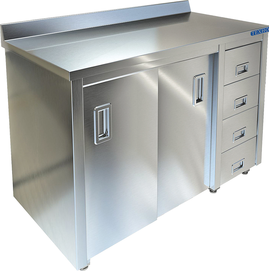 Производственный стол-тумба Техно-ТТ СПС-226/1707-П предназначен для разделки и обработки пищевых продуктов, а также для расстановки и хранения посуды и кухонного инвентаря на предприятиях общественного питания, торговли и пищевых производствах. Стол оснащен бортом, 2 дверьми-купе и 4 выдвижными ящиками. Материал корпуса - нержавеющая сталь AISI 430, материал столешницы - нержавеющая сталь AISI 304, материал задней стенки - оцинкованная сталь.