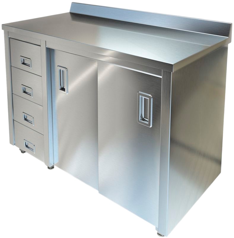 Производственный стол-тумба Техно-ТТ СПС-226/1607-Л предназначен для разделки и обработки пищевых продуктов, а также для расстановки и хранения посуды и кухонного инвентаря на предприятиях общественного питания, торговли и пищевых производствах. Стол оснащен бортом, 2 дверьми-купе и 4 выдвижными ящиками. Материал корпуса - нержавеющая сталь AISI 430, материал столешницы - нержавеющая сталь AISI 304, материал задней стенки - оцинкованная сталь.