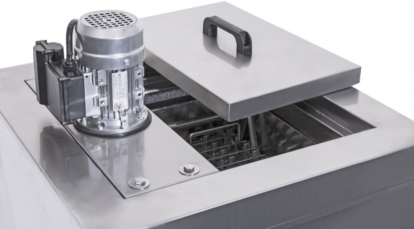 Корзина разделенная на 40 порций с дозированным соком или молоком опускается в ванну с пропилен гликолем, где при температуре -30 градусов Цельсия жидкость замерзает.