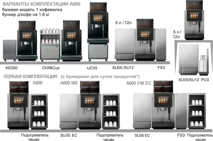 - 1 или 2 бункера для сухих продуктов: молока и шоколада по 0,6 / 1,2 кг каждый