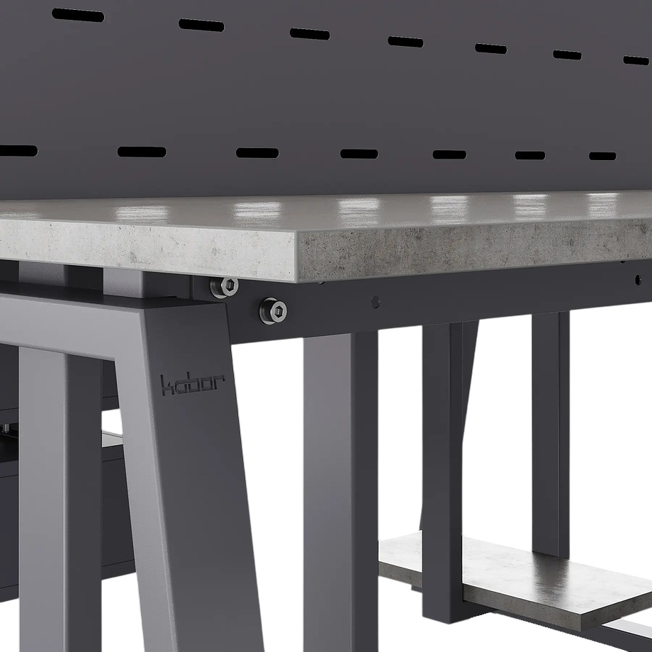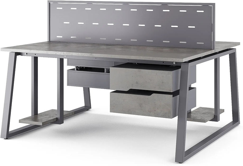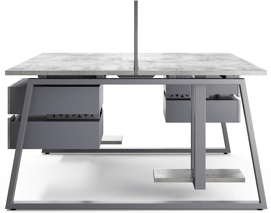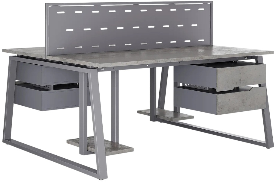 Офисный стол Кобор TR/2-140/140 graphite/chicago предназначен для двух рабочих мест и идеально подходит для офисов и кабинетов руководителей. Модель оснащена опорами в форме трапеции. Материал столешницы - прочный ЛДСП толщиной 25 мм, усиленная снизу металлическим каркасом, материал опор и каркаса - окрашенный металл.