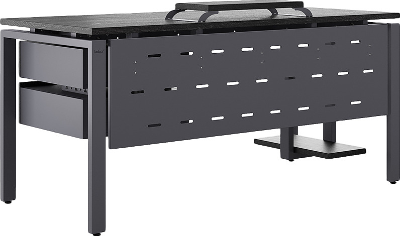 Офисный стол КОБОР P-140/70 graphite/wood используется в офисных помещениях и кабинетах руководителей. Модель оснащена П-образными опорами. Материал столешницы - прочный ЛДСП толщиной 25 мм, усиленная снизу металлическим каркасом, материал опор и каркаса - окрашенный металл.
