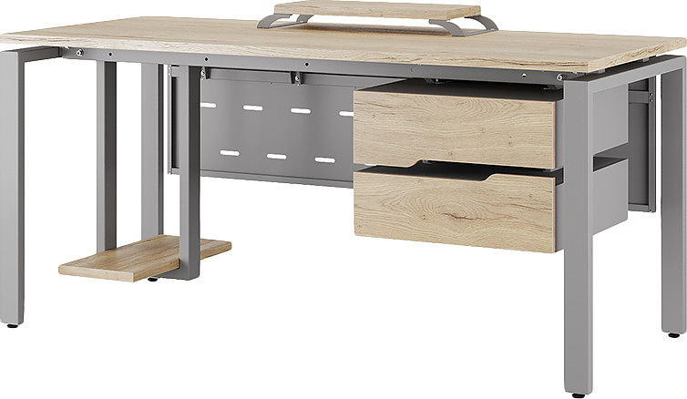 Офисный стол КОБОР P-140/70 aluminum/natural используется в офисных помещениях и кабинетах руководителей. Модель оснащена П-образными опорами. Материал столешницы - прочный ЛДСП толщиной 25 мм, усиленная снизу металлическим каркасом, материал опор и каркаса - окрашенный металл.