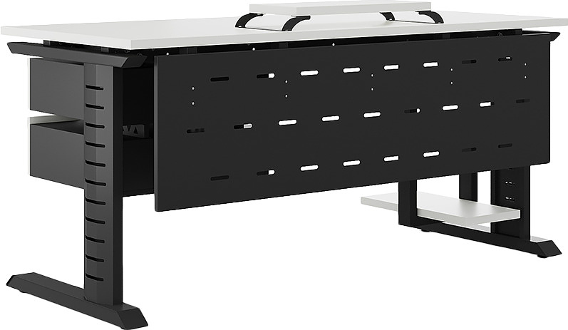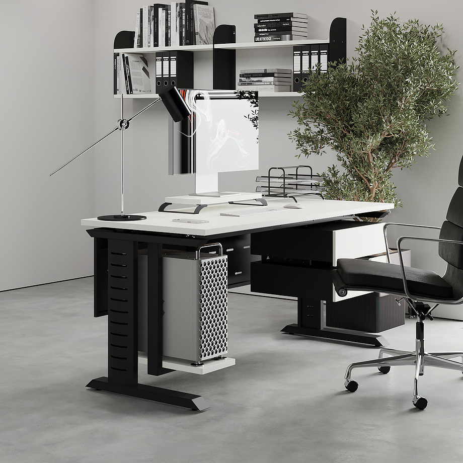 Офисный стол КОБОР L2-140/70 black/premium используется в офисных помещениях и кабинетах руководителей. Модель оснащена L-образными опорами с декоративной вставкой на боковинах. Материал столешницы - прочный ЛДСП толщиной 25 мм, усиленная снизу металлическим каркасом, материал опор - окрашенный металл.