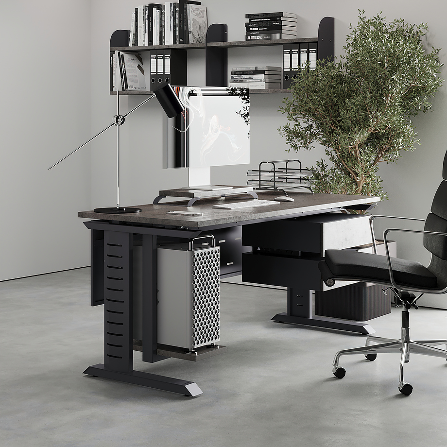 Офисный стол КОБОР L2-140/70 graphite/chicago используется в офисных помещениях и кабинетах руководителей. Модель оснащена L-образными опорами с декоративной вставкой на боковинах. Материал столешницы - прочный ЛДСП толщиной 25 мм, усиленная снизу металлическим каркасом, материал опор - окрашенный металл.