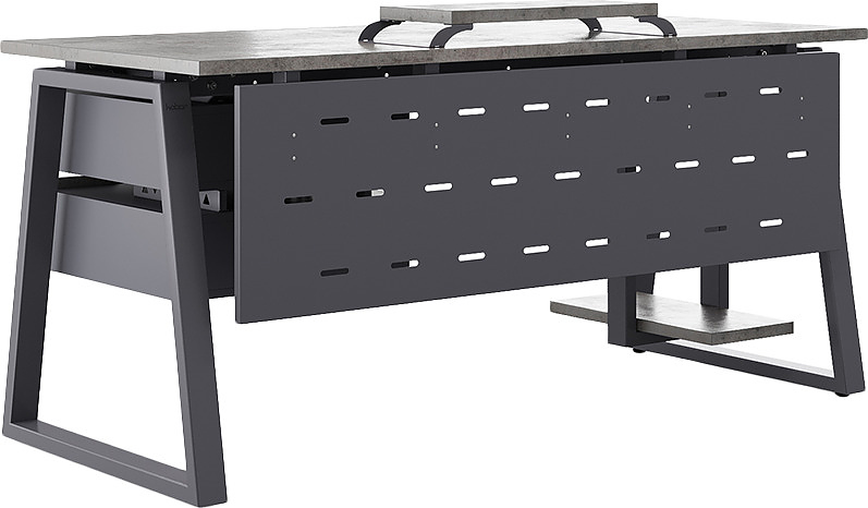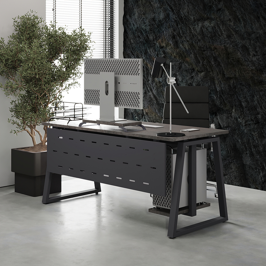 Офисный стол КОБОР TR-140/70 graphite/chicago используется в офисных помещениях и кабинетах руководителей. Модель оснащена трапециообразными опорами. Материал столешницы - прочный ЛДСП толщиной 25 мм, усиленная снизу металлическим каркасом, материал опор - окрашенный металл.