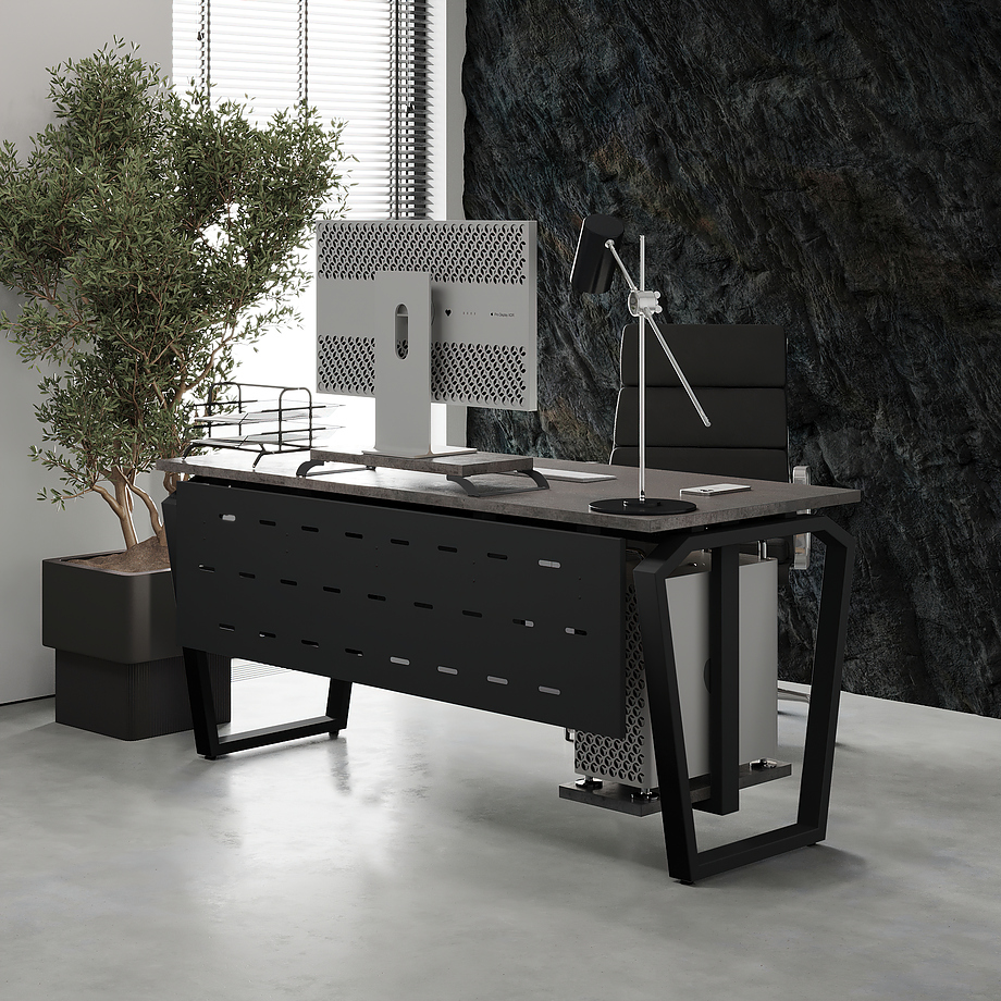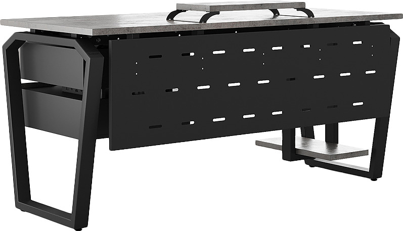 Офисный стол КОБОР TB-120/60 black/chicago используется в офисных помещениях и кабинетах руководителей. Конструкция модели включает опоры, выполненные в виде перевернутой трапеции со скошенными верхними углами. Материал столешницы - прочный ЛДСП толщиной 25 мм, усиленная снизу металлическим каркасом, материал опор - окрашенный металл.
