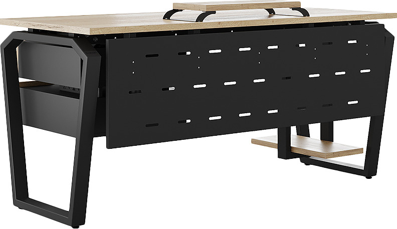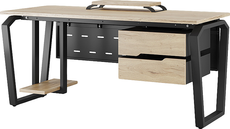 Офисный стол КОБОР TB-140/70 black/natural используется в офисных помещениях и кабинетах руководителей. Конструкция модели включает опоры, выполненные в виде перевернутой трапеции со скошенными верхними углами. Материал столешницы - прочный ЛДСП толщиной 25 мм, усиленная снизу металлическим каркасом, материал опор - окрашенный металл.