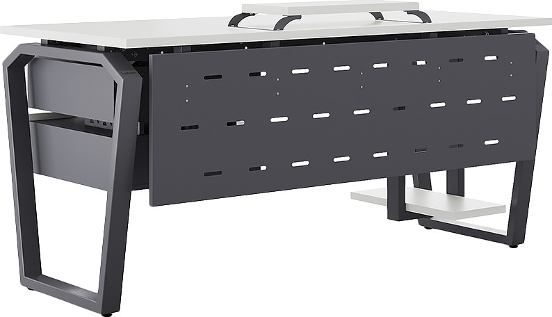 Офисный стол КОБОР TB-120/60 graphite/premium используется в офисных помещениях и кабинетах руководителей. Конструкция модели включает опоры, выполненные в виде перевернутой трапеции со скошенными верхними углами. Материал столешницы - прочный ЛДСП толщиной 25 мм, усиленная снизу металлическим каркасом, материал опор - окрашенный металл.