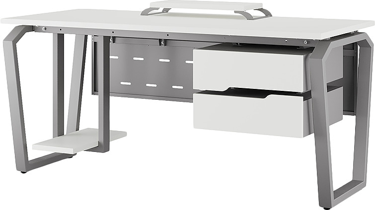 Офисный стол КОБОР TB-120/60 aluminum/premium используется в офисных помещениях и кабинетах руководителей. Конструкция модели включает опоры, выполненные в виде перевернутой трапеции со скошенными верхними углами. Материал столешницы - прочный ЛДСП толщиной 25 мм, усиленная снизу металлическим каркасом, материал опор - окрашенный металл.