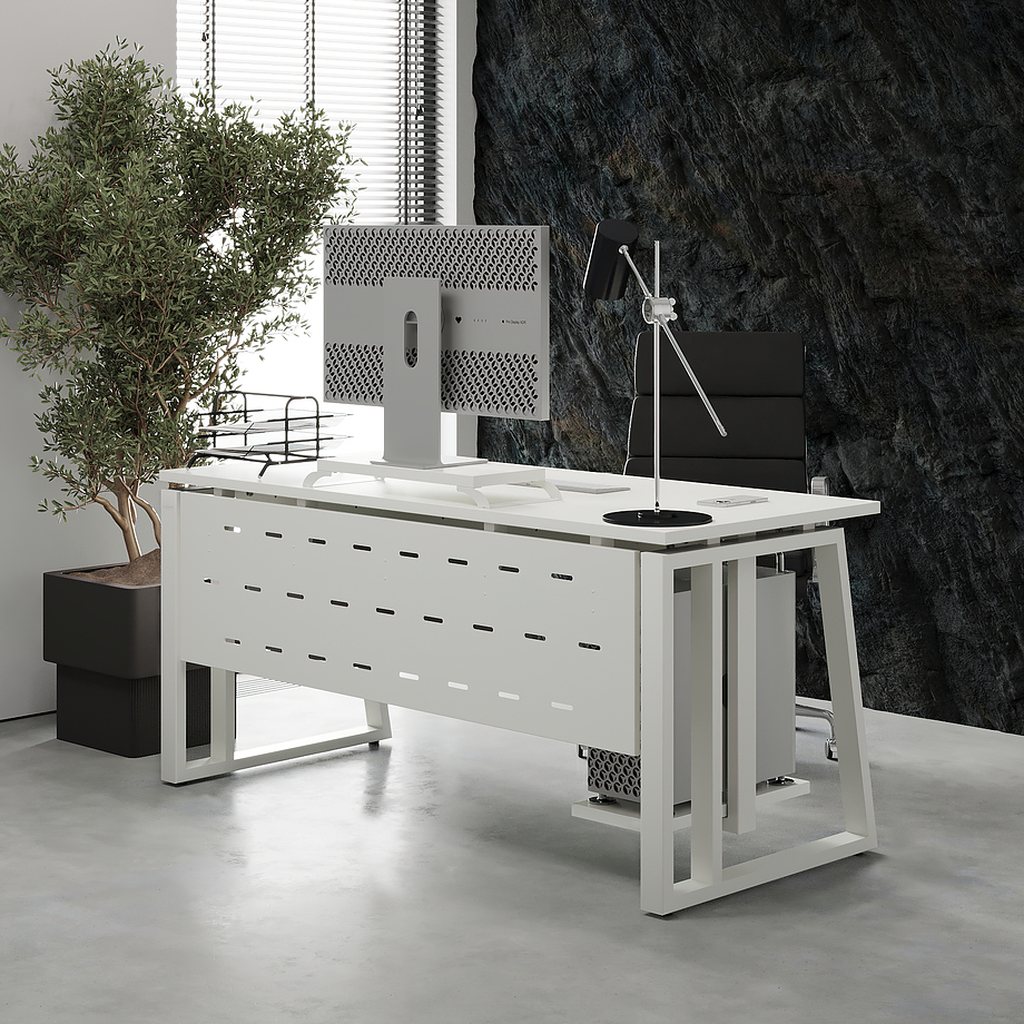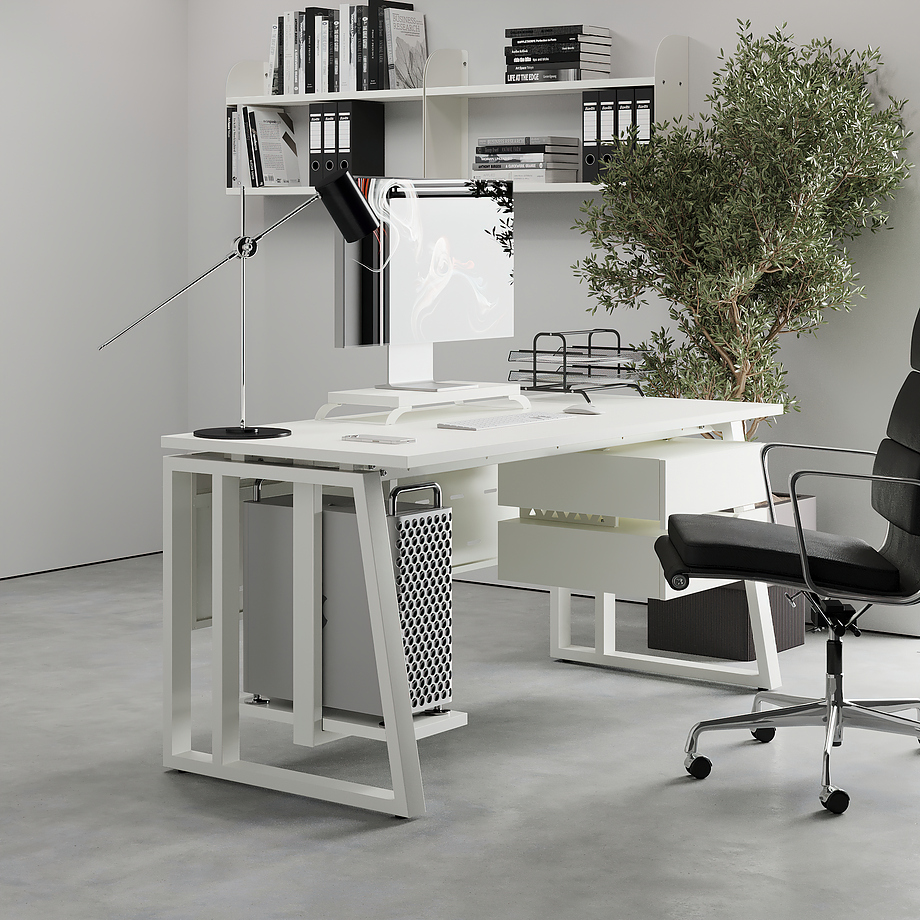 Офисный стол КОБОР TS2-140/70 white/premium используется в офисных помещениях и кабинетах руководителей. Модель оснащена опорами в форме наклонной трапеции с усиленными вертикальными балками. Материал столешницы - прочный ЛДСП толщиной 25 мм, усиленная снизу металлическим каркасом, материал опор - окрашенный металл.