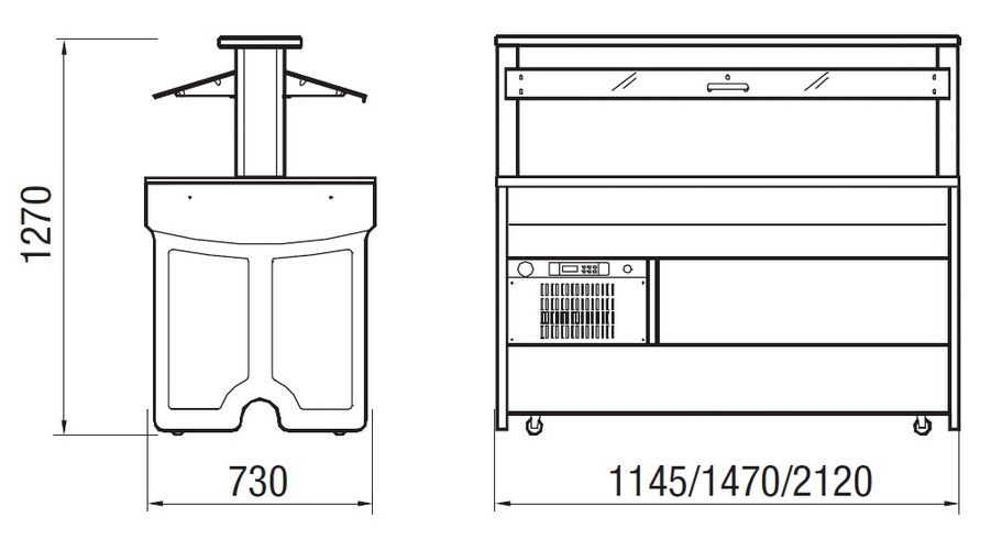 • Для подключения салат-бара используется бытовая электросеть с напряжением 220 вольт, однако можно заказать модификацию, питающуюся от трёхфазной сети 380 вольт. Оборудование потребляет не более 2,45 кВт в час.