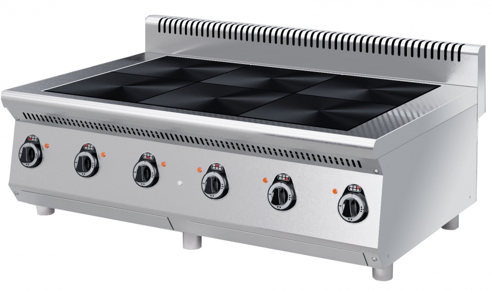 Электрическая плита KAYMAN ПЭ-6-121-МХ используется на предприятиях общественного питания, торговли и пищевых производствах для приготовления блюд в наплитной посуде. 2 терморегулятора на передней панели. Плита оснащена воздуховодом. Материал корпуса - нержавеющая сталь.