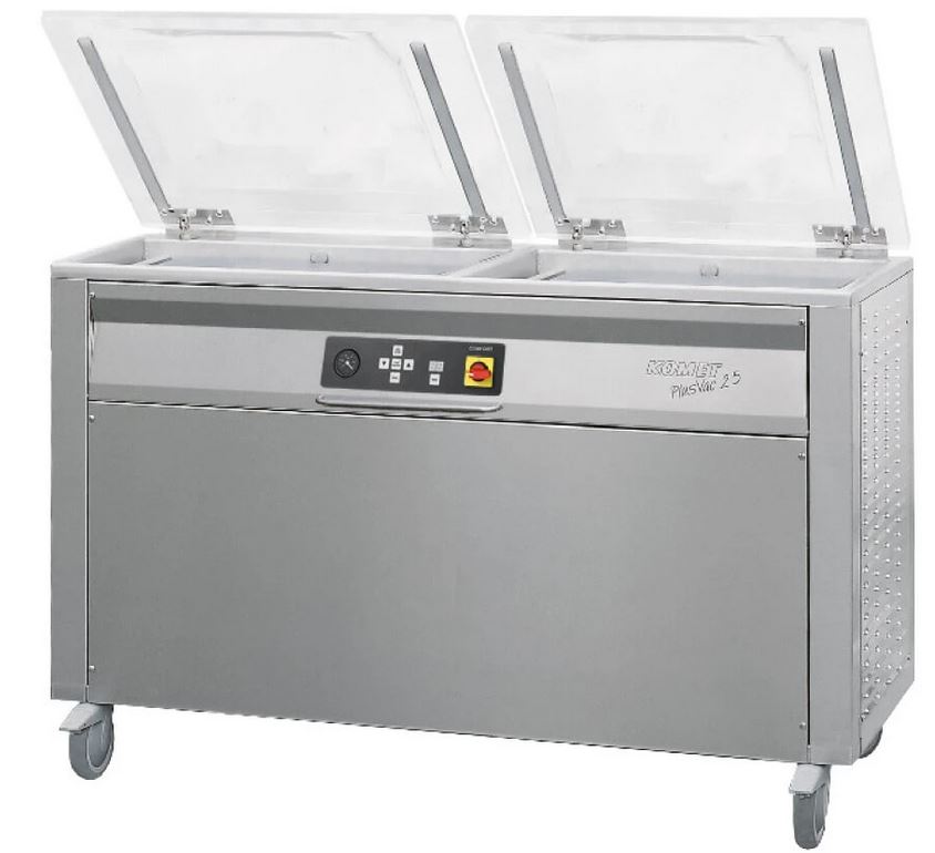 Вакуумный упаковщик KOMET PLUSVAC 25 используется предназначается для вакуумной упаковки мяса, сухофруктов, хлебобулочных изделий, гранулированных, порошкообразных и жидких продуктов на предприятиях общественного питания, торговли и пищевых производствах. Управление при помощи сенсорной панели, регулировка времени откачки воздуха и запайки. Упаковщик оснащен легкозаменяемой беспроводной запаечной планкой и заполняющими пластинами, регулирующими высоту. Материал корпуса - нержавеющая сталь, материал крышки - оргстекло.