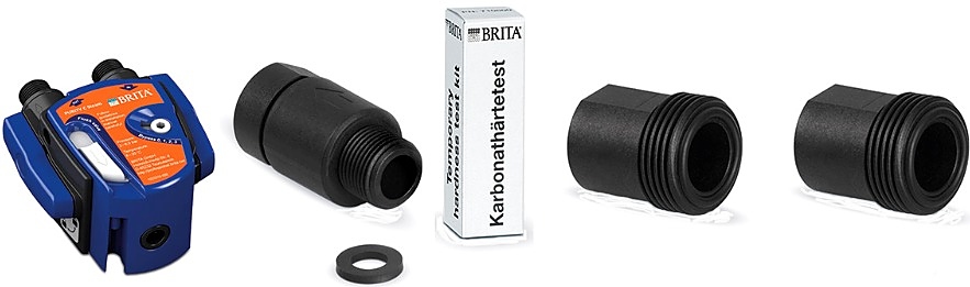 Комплект: головная часть с настраиваемым bypass, тест для определения карбонатной жесткости (KH), обратный клапан и 2 пластиковых переходника (G3/8 - G3/4).